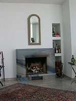 Kamin aus Massiv- Stücken, Ansicht gewölbt, Material "Azul Macauba" poliert. |