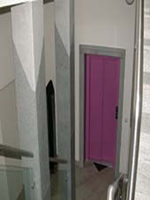 großzügige Gestaltung des Treppenhauses mit Naturstein. Material "Diorite" poliert. Säulenverblendung und Aufzug- umrahmung. Bearbeitung poliert und geflammt. Stufen und Bodenbelag, Material "Imperial White", Diagonalverlegung im Dickbett. |